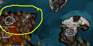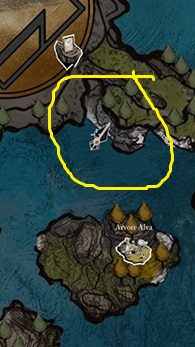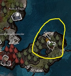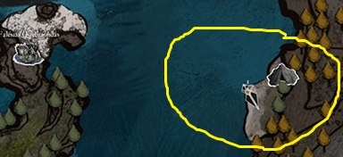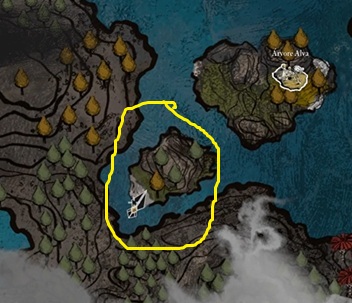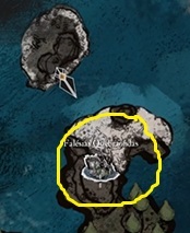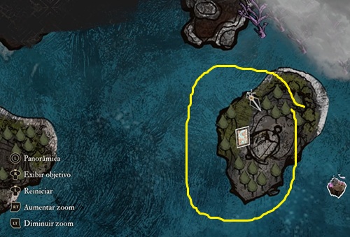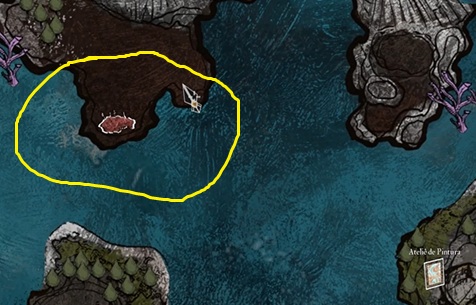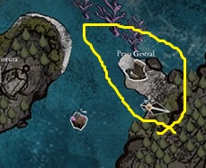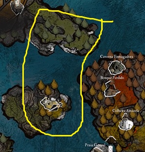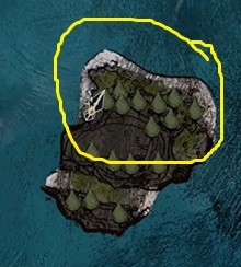 Saindo da Praia Gestral, parte II, pegue o caminho à direita para nadar. Continue indo em linha reta, para a parte de baixo do mapa, até você encontrar a ilha abaixo.