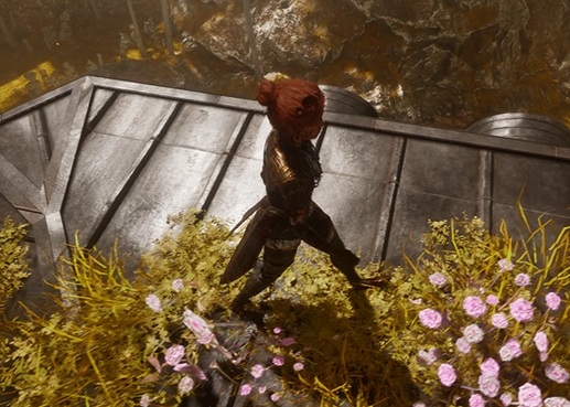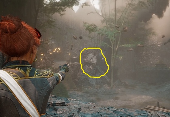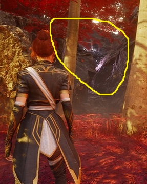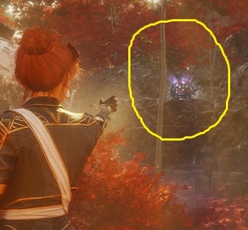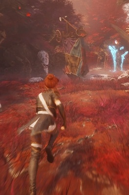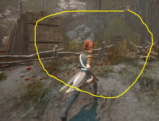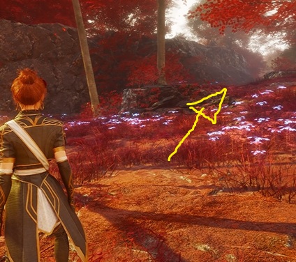 Logo depois, você verá dois caminhos, uma subida e uma passagem. Vá pela passagem e, no final, pegue Fragmento de Tinta Restauradora. Volte e suba a ladeira até a bandeira.