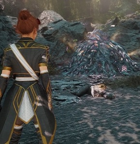Após a luta, siga até encontrar um gancho, use-o e continue pelo único caminho até chegar a um local com bandeiras e corpos. Continue em frente até a cutscene. Depois dela, você estará em outra luta e a Lune entrará para a equipe.