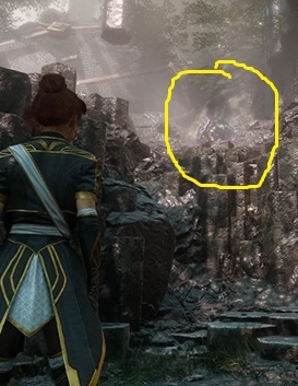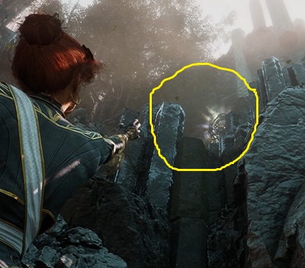 Da bandeira, pegue a direita até o grappling hook. Continue o caminho, mas antes de pegar o próximo grappling, vire à direita passando pelo arco de uma porta quebrada para pegar Tom de lumina.