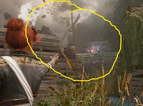 A partir do ângulo da foto, mire no baú e vire a mira para a esquerda, sem andar, apenas movendo a mira. Você vai encontrar o primeiro cadeado, conforme a imagem.