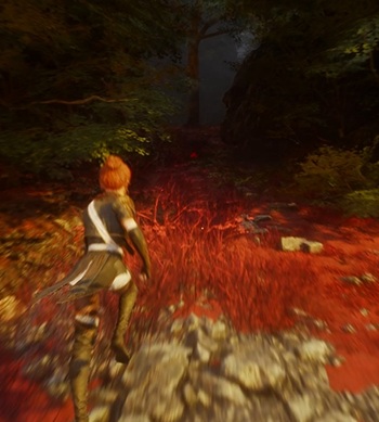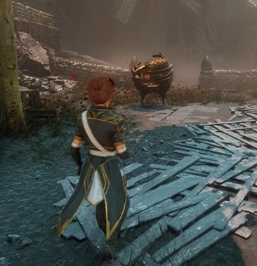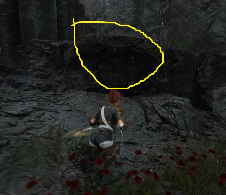 Desça as escadas e pegue a outra leva de escadas à esquerda. Você vai encontrar um trio de inimigos, enfrente eles. Pegue o caminho à direita pra ir até uma árvore e, da árvore, vá pela esquerda até o final pra pegar um item ao lado de uma espada caída: Fragmento de tintura curativa.