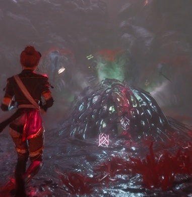 Siga o caminho de corpos e sangue pra achar um brilho. Interaja pra ativar uma corda. Suba e você vai achar outro brilho. Mas antes de pegar essa corda, veja que à esquerda tem um buraco na parede. Vá por ele pra pegar mais um Tom de lumina.