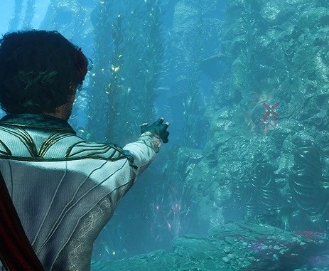 Continue girando a mira para a esquerda e o último cadeado estará no meio das algas, conforme a imagem.