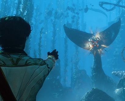 Continue girando a mira para a esquerda para encontrar o segundo cadeado, na cauda de uma baleia, conforme a imagem.