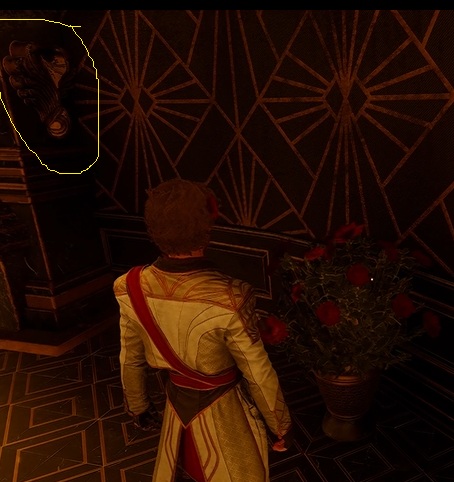 Volte, pegue a esquerda, siga, pegue a direita e direita novamente e siga reto. Vire à direita um pouco antes da porta grande (provavelmente vai ter um trompetista te seguindo). Enfrente ele e pegue o item escondido à direita: 3950 Chromas.