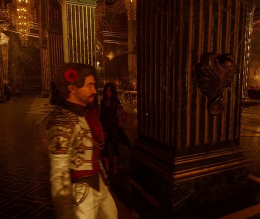 Depois, siga o caminho. Você pode interagir com quem quiser; não interagir não te faz perder nenhum item. Quando o corredor de pessoas acabar, vá para o lado direito até encontrar uma escada. Suba e, ao final, pegue mais 125 chromas. Vire-se à esquerda e pule pela abertura da grade.